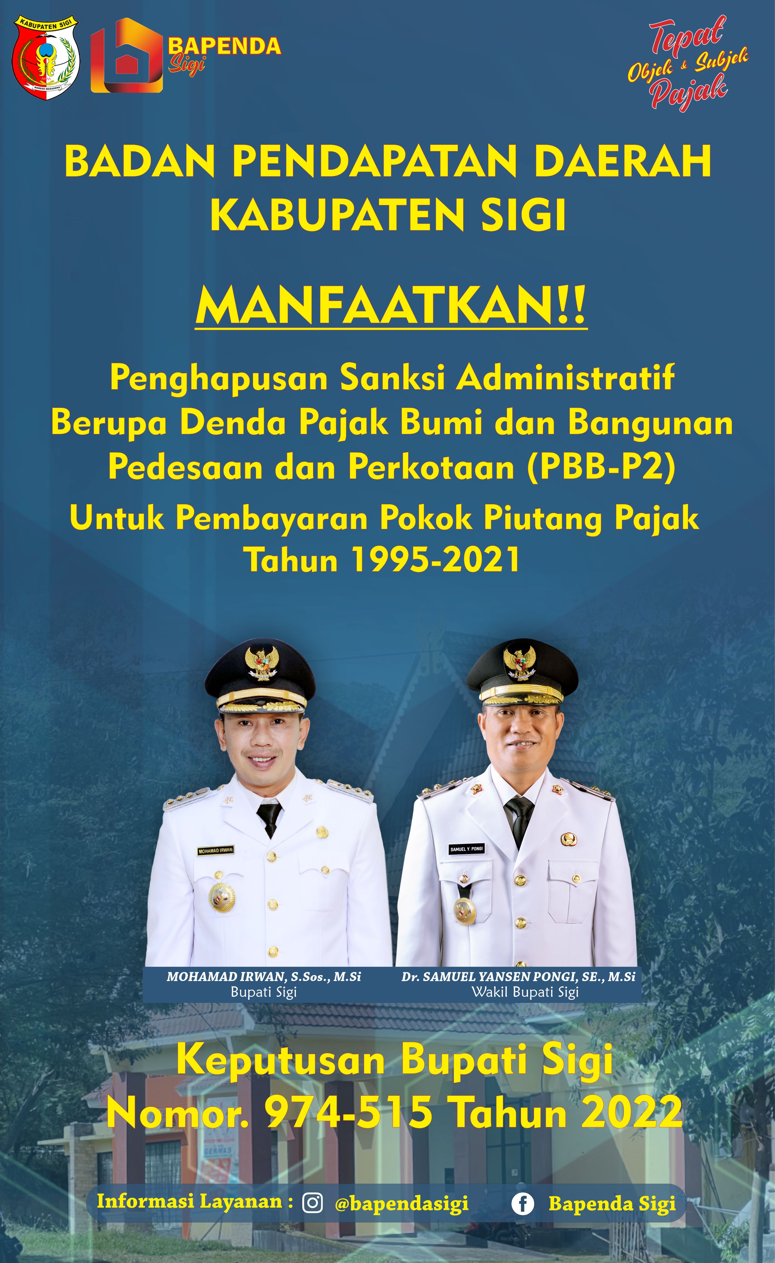 MANFAATKAN PENGHAPUSAN SANKSI ADMINISTRASI DENDA PAJAK (PBB-P2), JADI POKOK NYA SAJA YANG DI BAYAR YA,DENDANYA DI HAPUS. SK BUPATI SIGI NOMOR.974-515 THN 2022.
